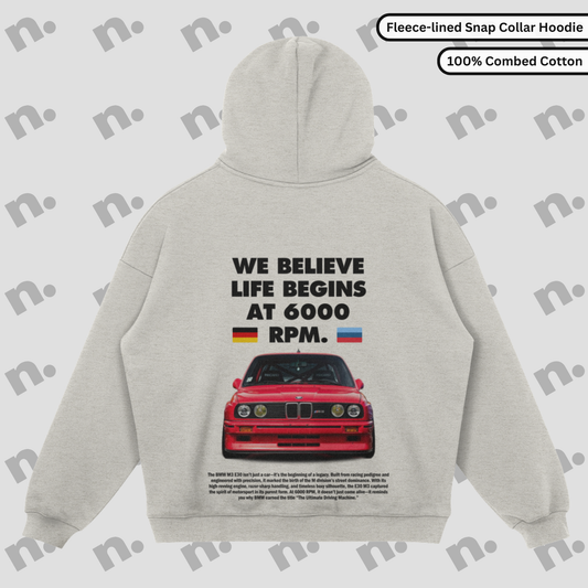 E30 M3 "Life Begins at 6000 RPM" Snap-Collar Hoodie