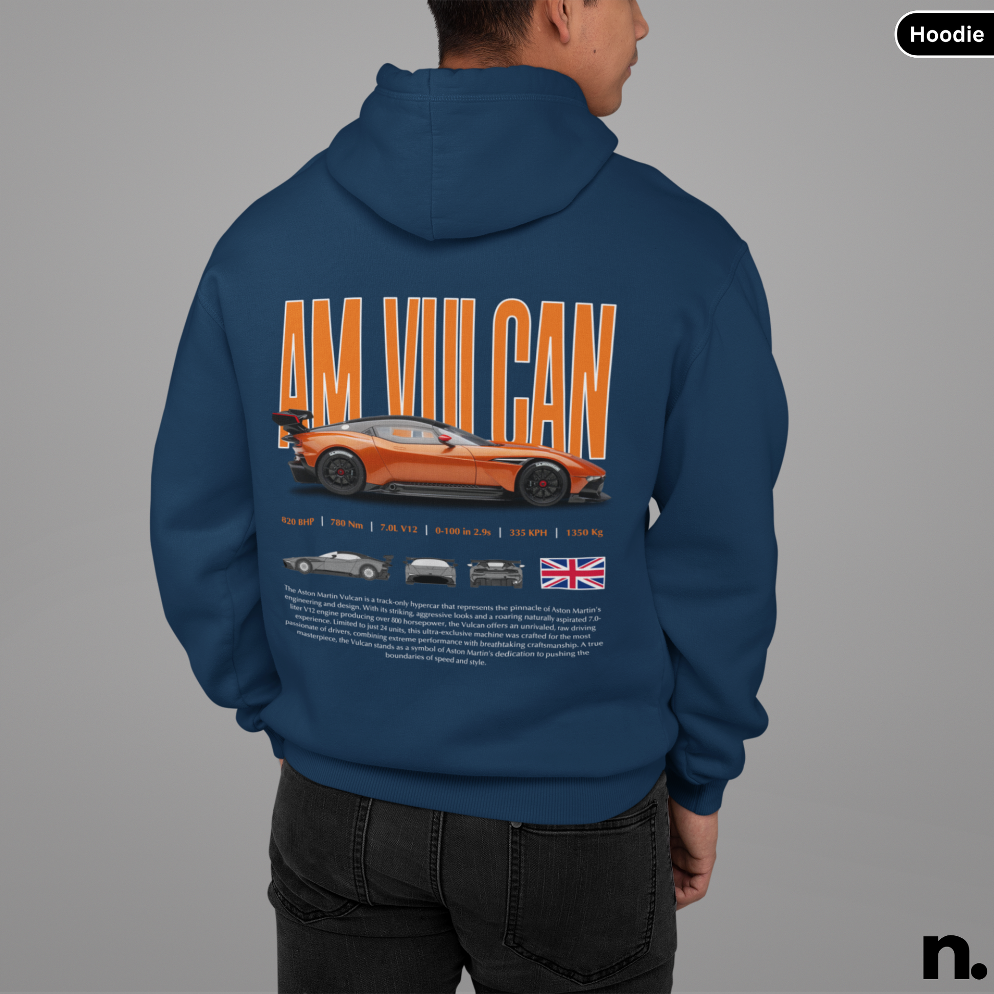 A cozy and warm hoodie featuring a AM Vulcan poster style back print with an American racing theme. Perfect for car enthusiasts and those who appreciate American racing culture. Ideal for casual wear or as a statement piece during car shows and races.