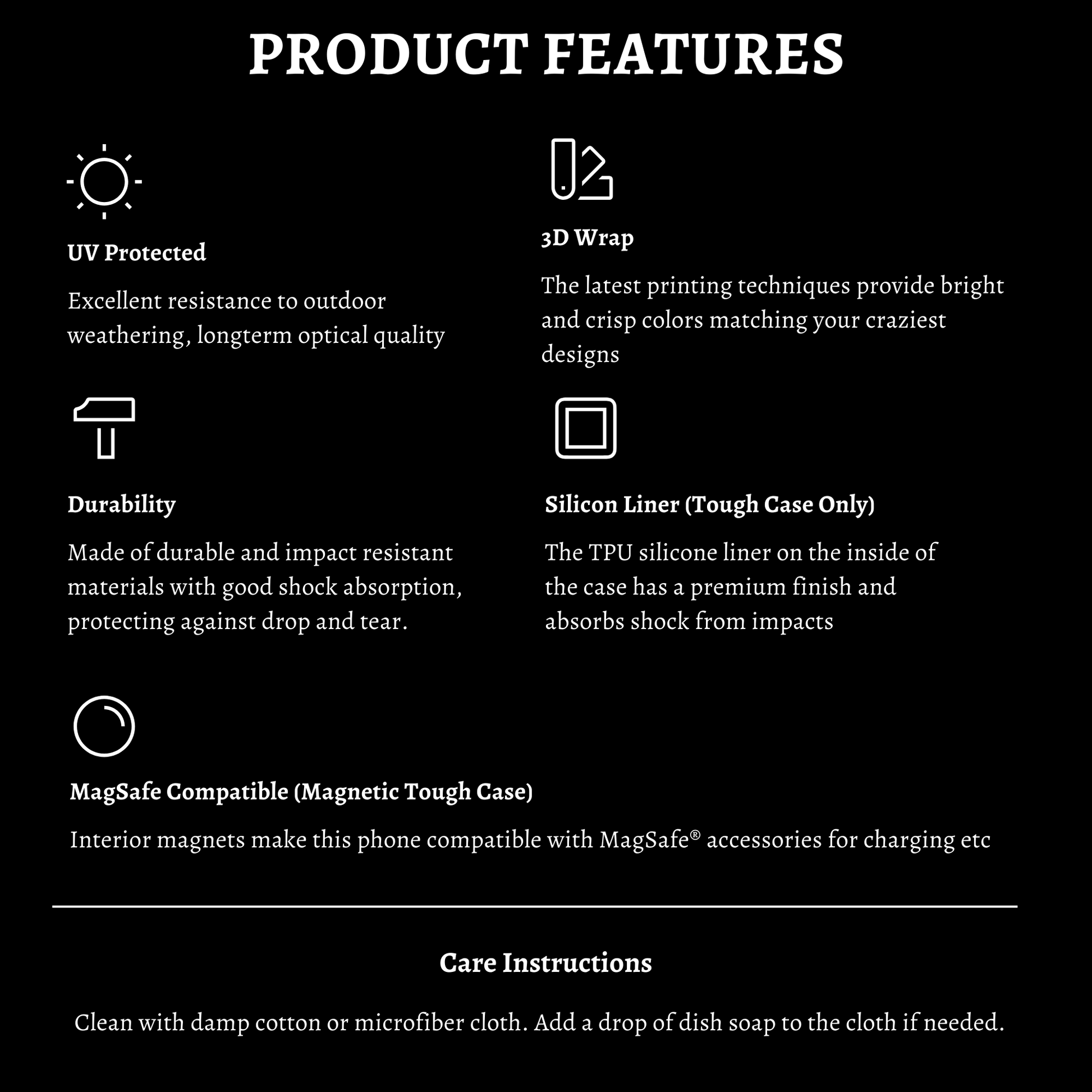 We offer our phone cases in three distinct styles to cater to a variety of needs: Snap Case, Tough Case, and Magnetic Tough Case. Each option is designed with premium materials and features to provide a unique combination of style, functionality, and protection. Below is a detailed comparison of the three: