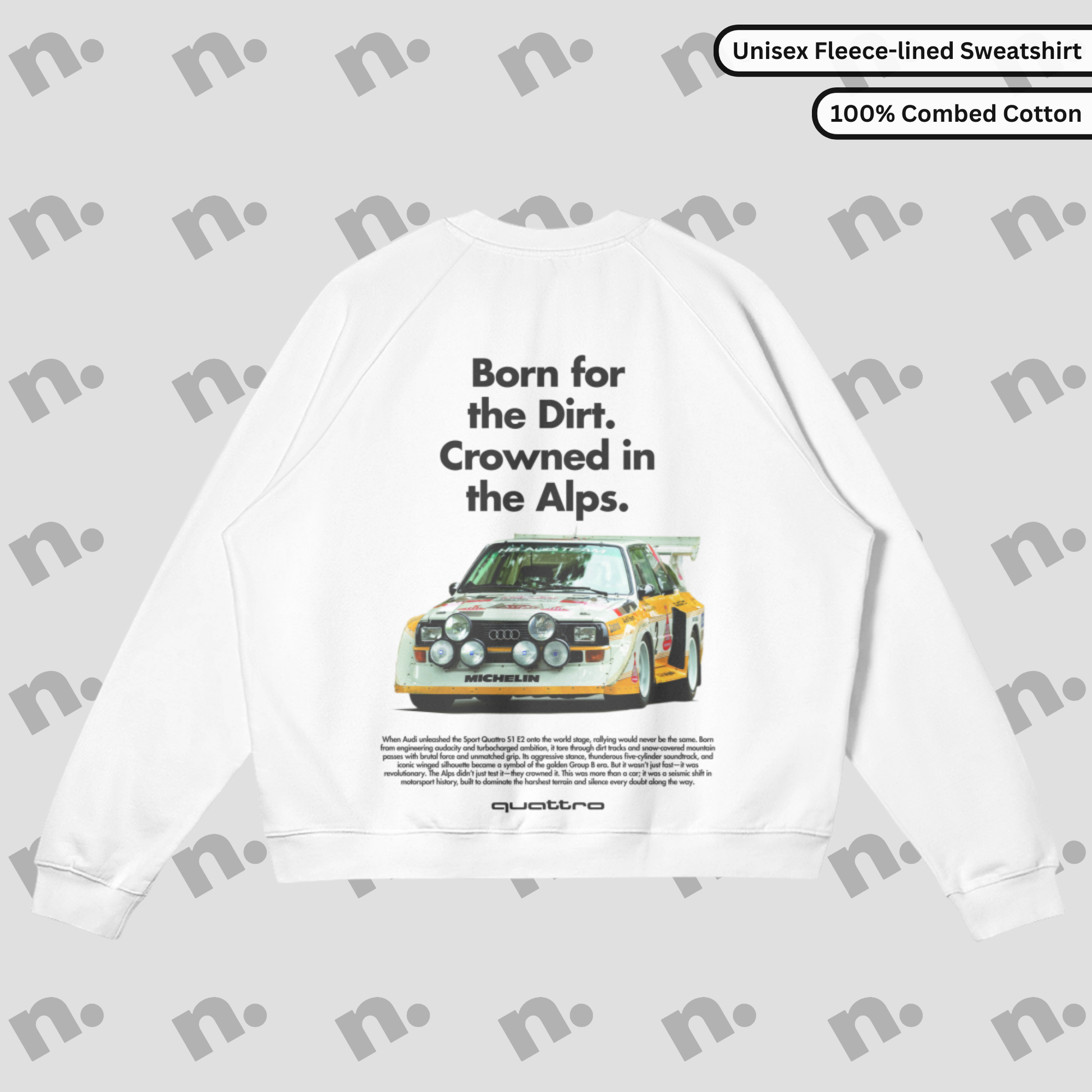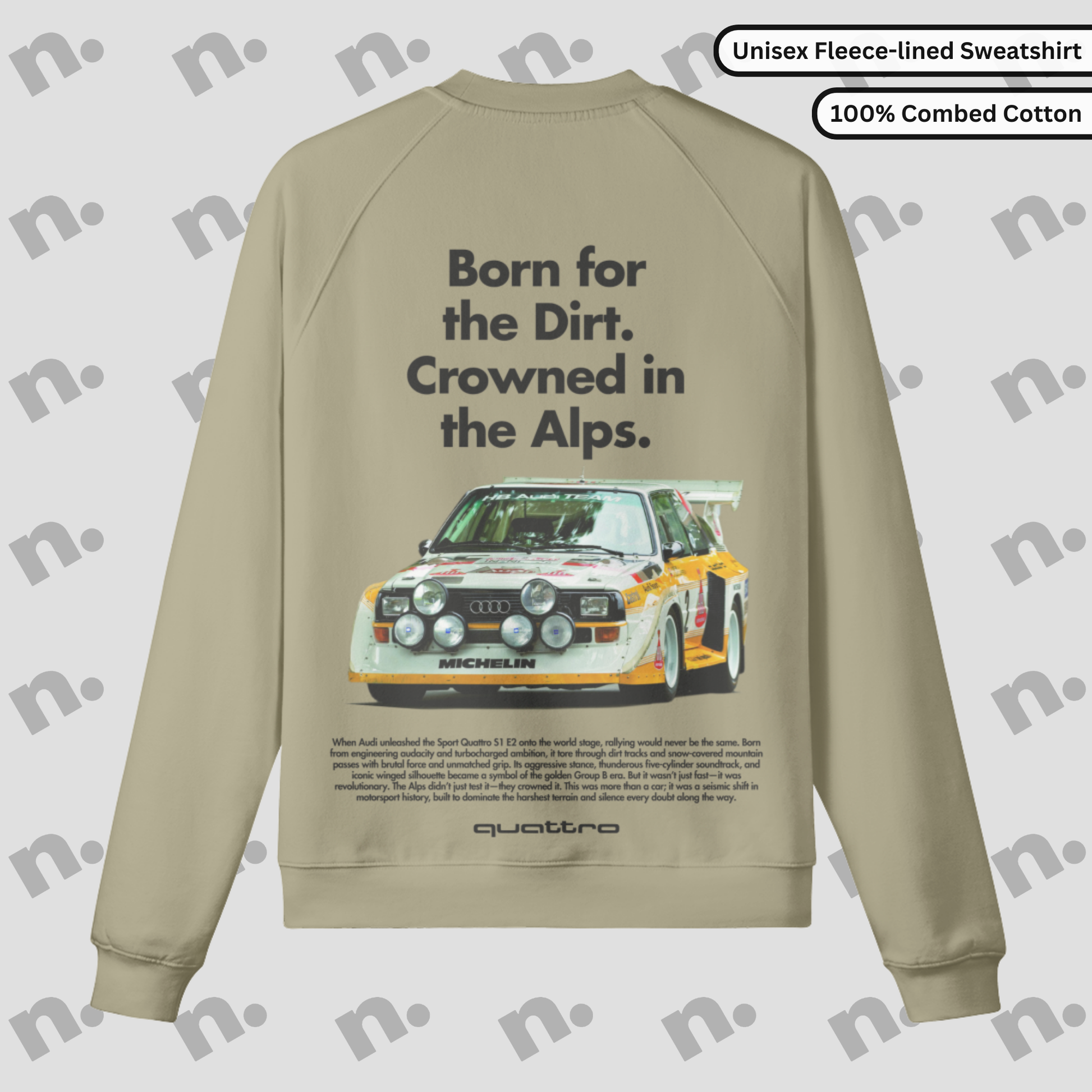 Inspired by the relentless power of the Quattro S1 E2, this fleece-lined raglan sweatshirt delivers heritage motorsport attitude with everyday versatility. Its earth-tone palette mirrors the rugged terrain the rally icon conquered, while the relaxed raglan fit ensures ease of movement—on or off the road. Crafted from heavyweight, pre-shrunk cotton and brushed with a soft fleece interior, it's built for warmth, comfort, and the kind of timeless cool that refuses to fade. Crowned in the Alps, made for the streets.