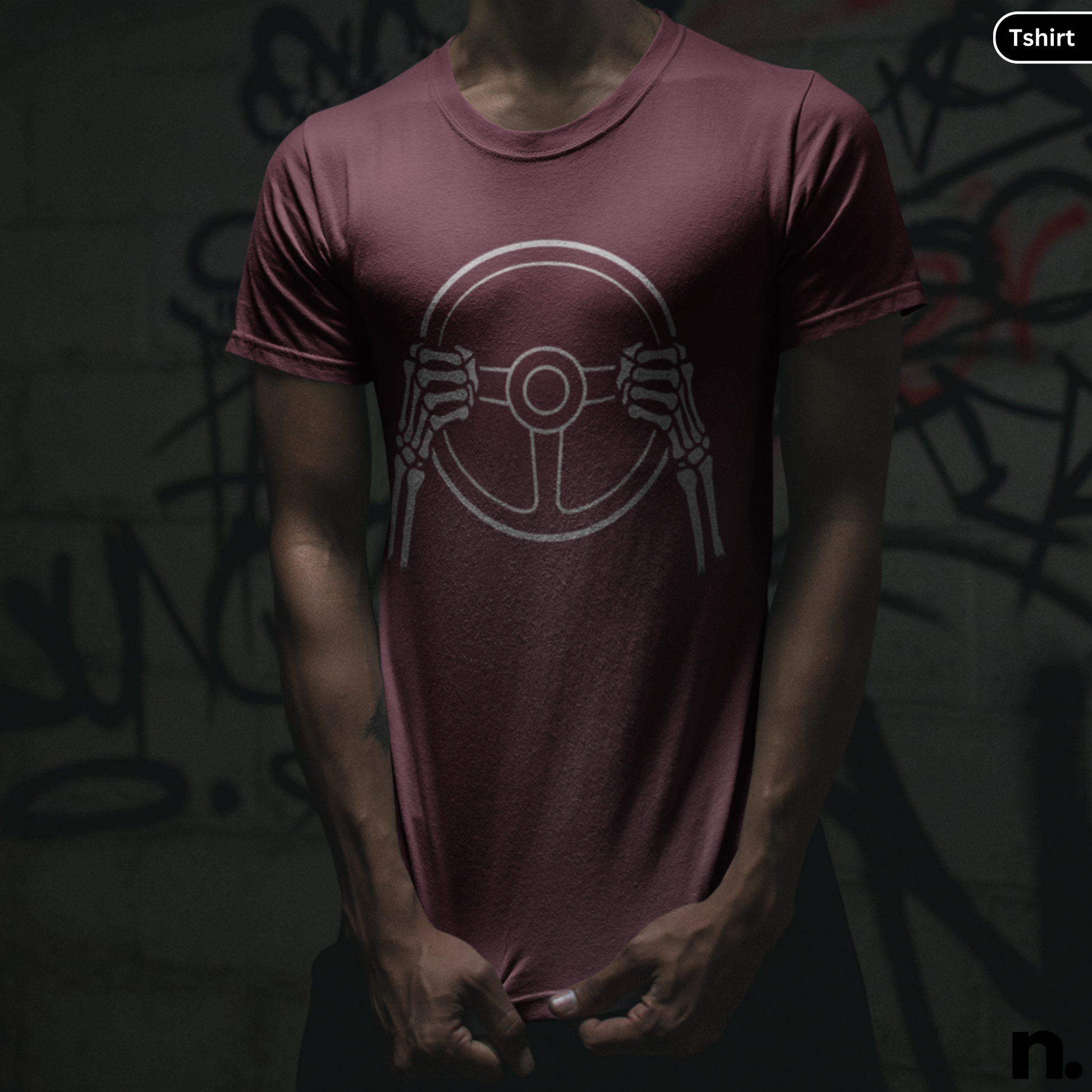 A Halloween inspired tee perfect for the spooky season, featuring a fun death behind wheel design. This unisex T-Shirt is made with environmentally-friendly cotton, providing a thick vintage feel and long-lasting comfort. Suitable for adults, this tee is a versatile choice for casual and semi-formal occasions, blending seamlessly into any setting.