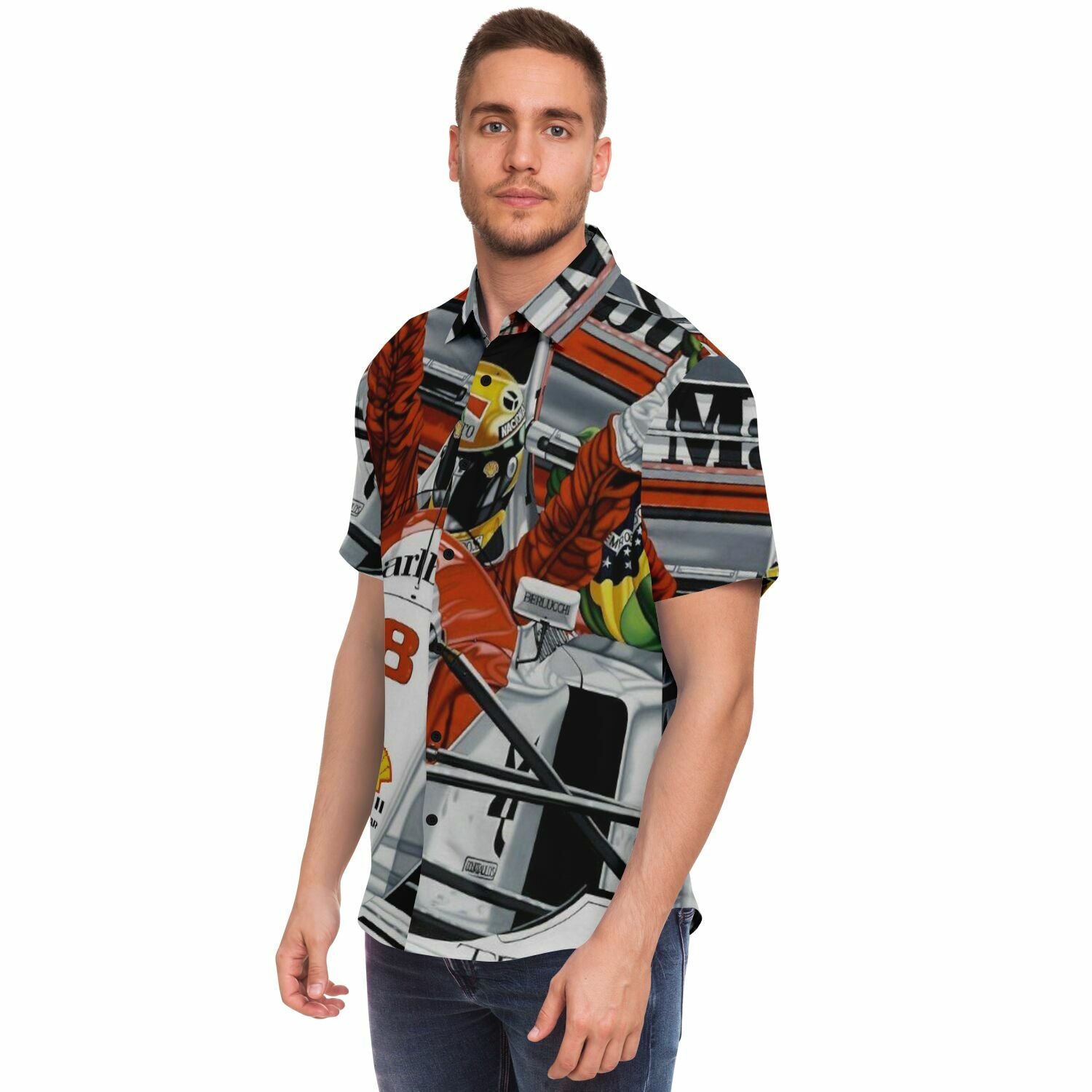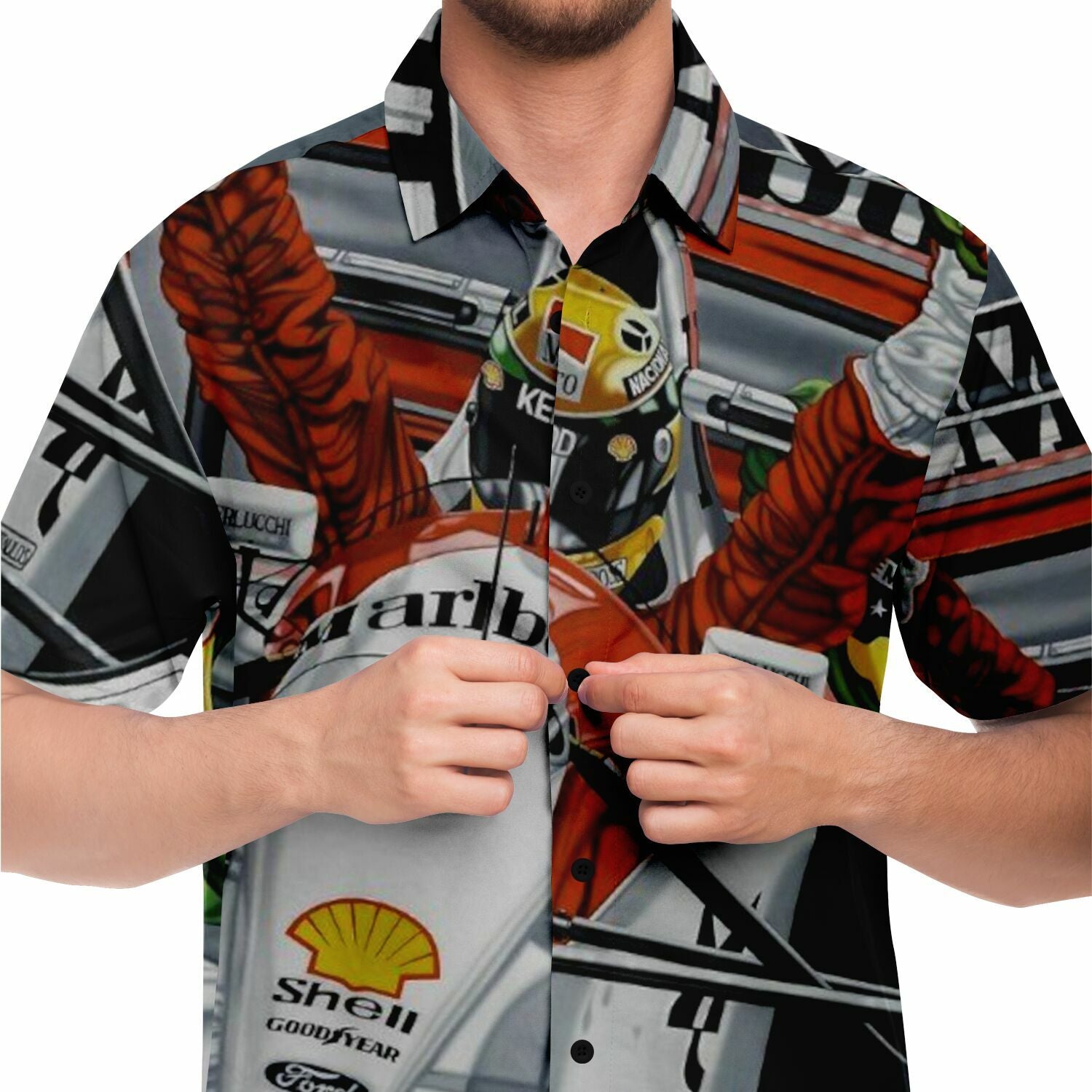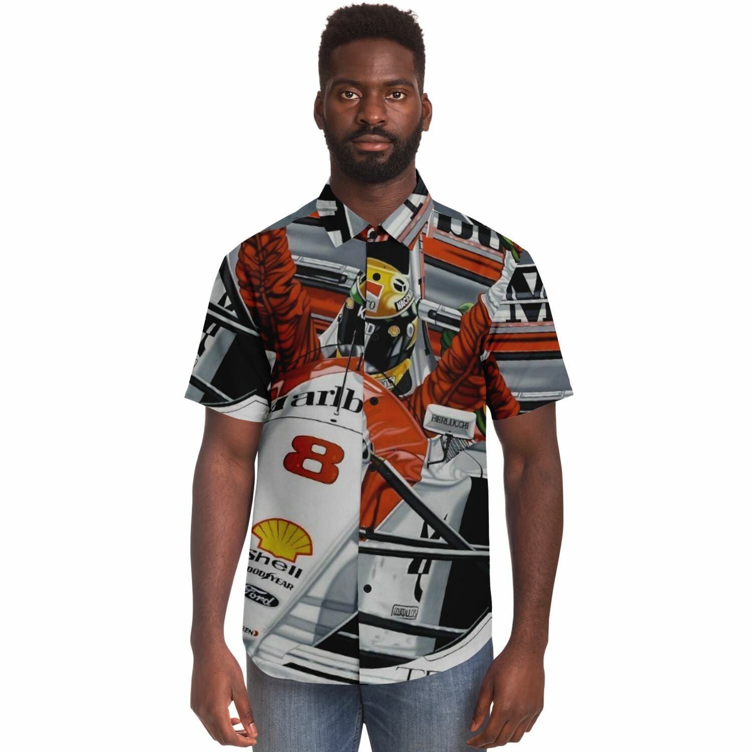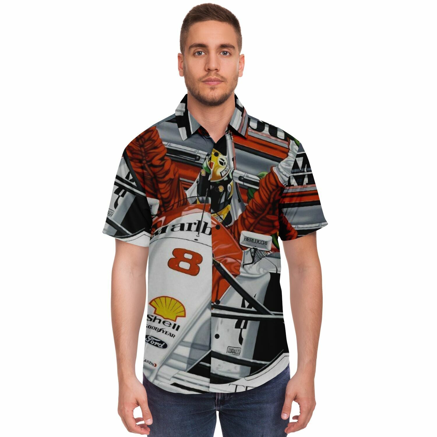 F1 Win Poster Short Sleeve Button Down Shirt - AOP