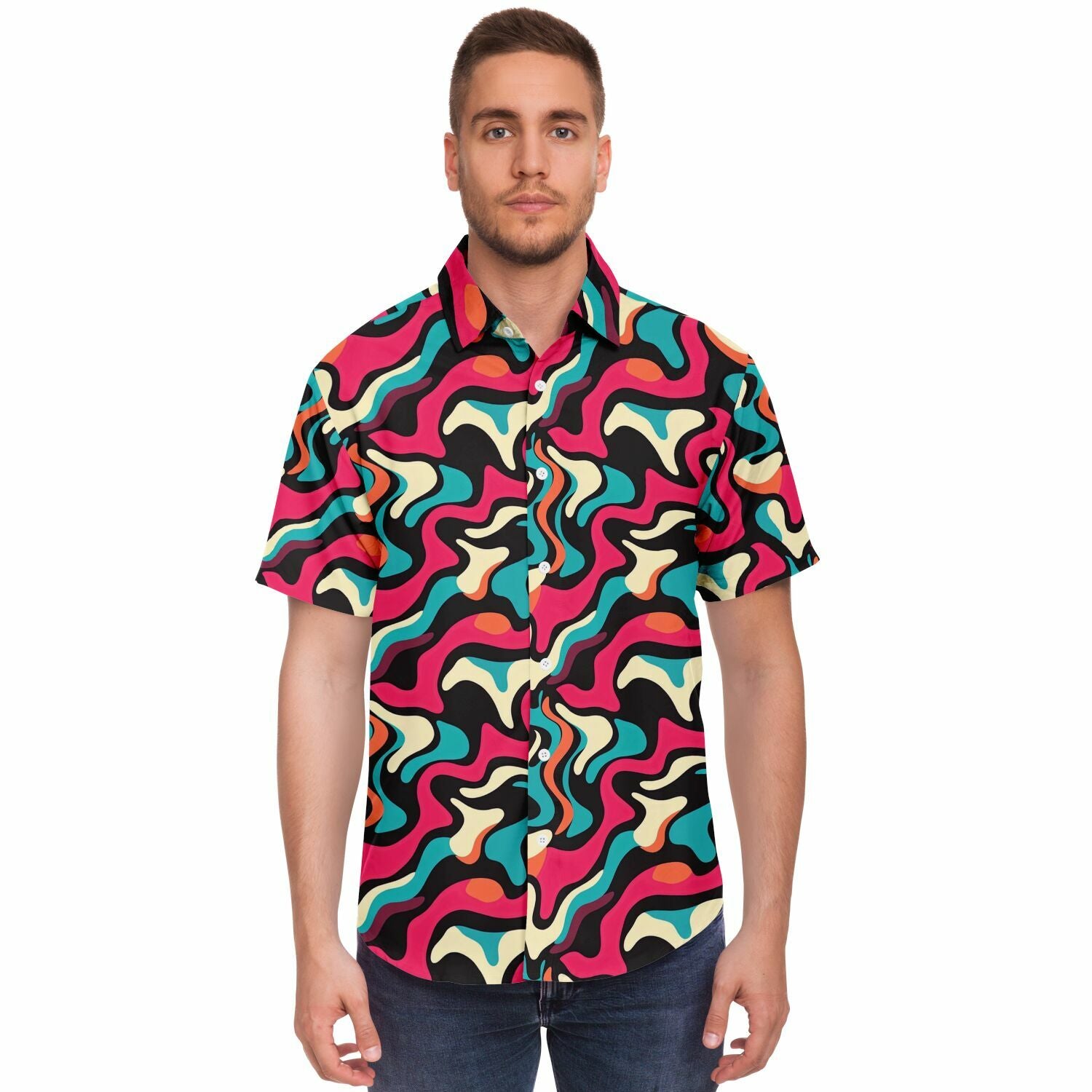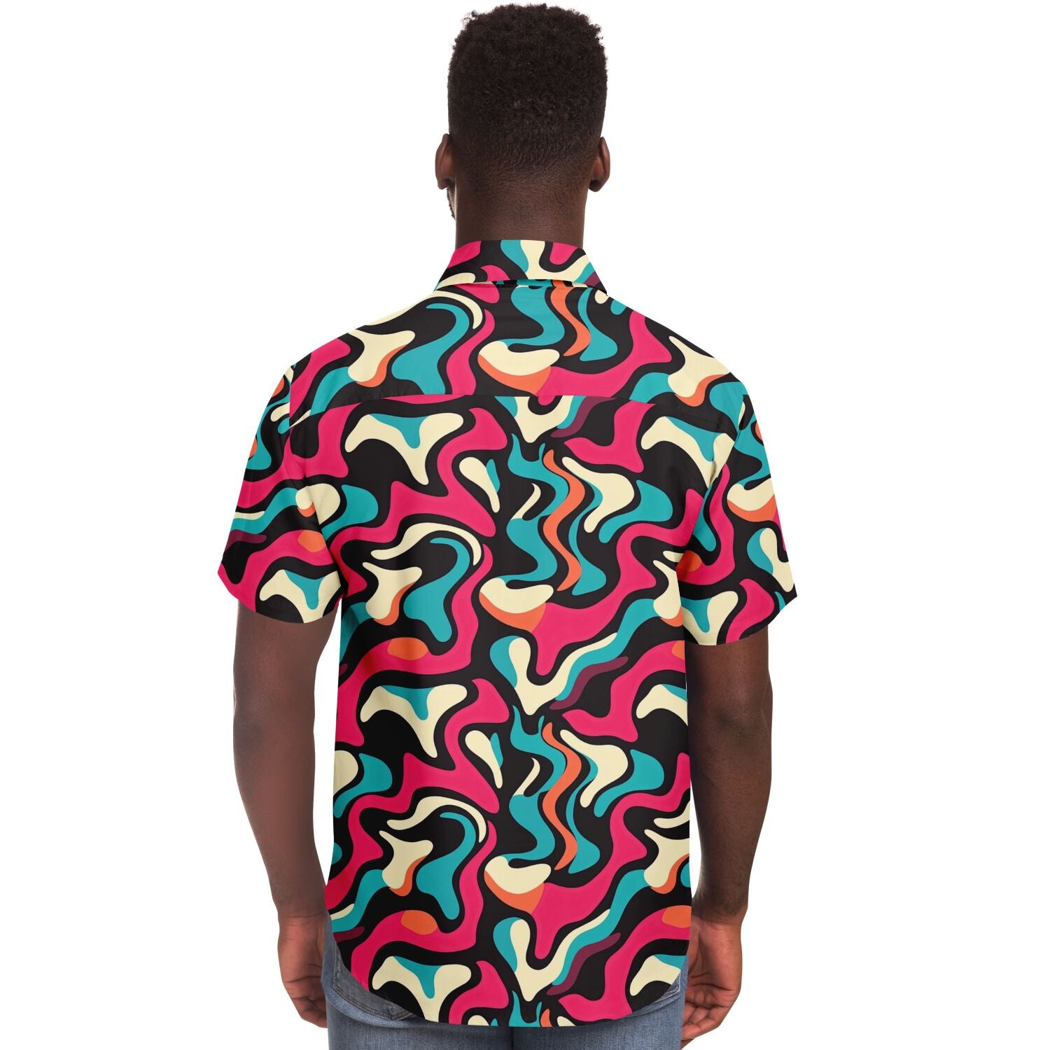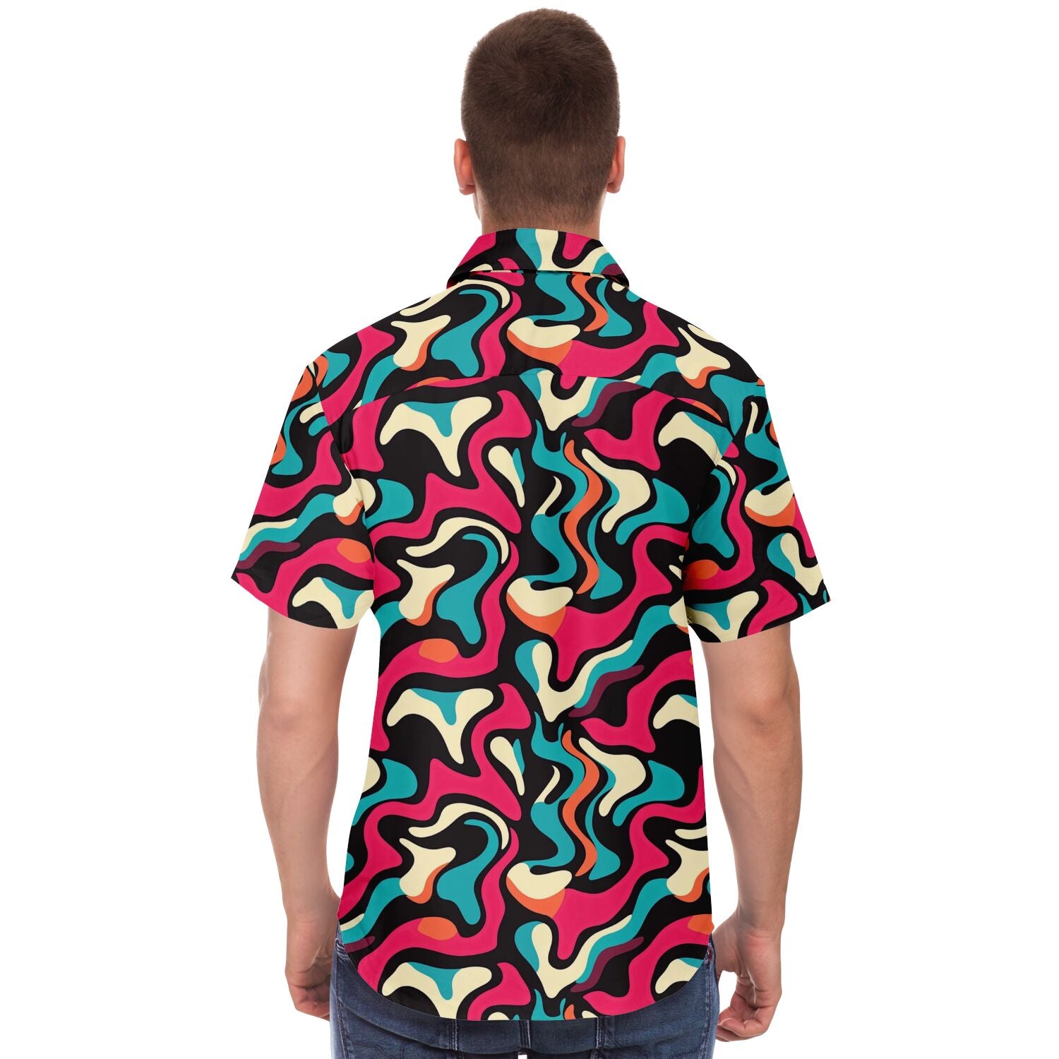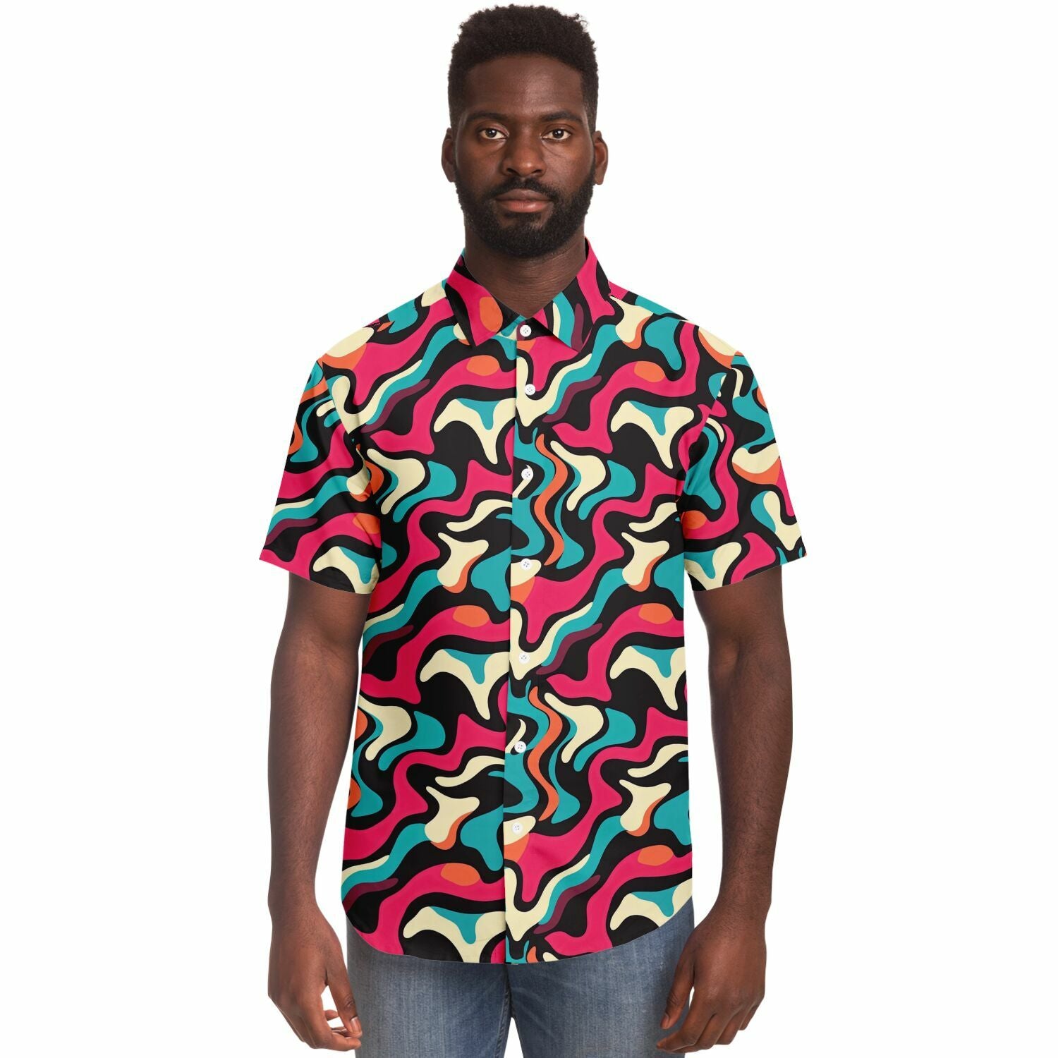 Red Blue Pattern Short Sleeve Button Down Shirt - AOP