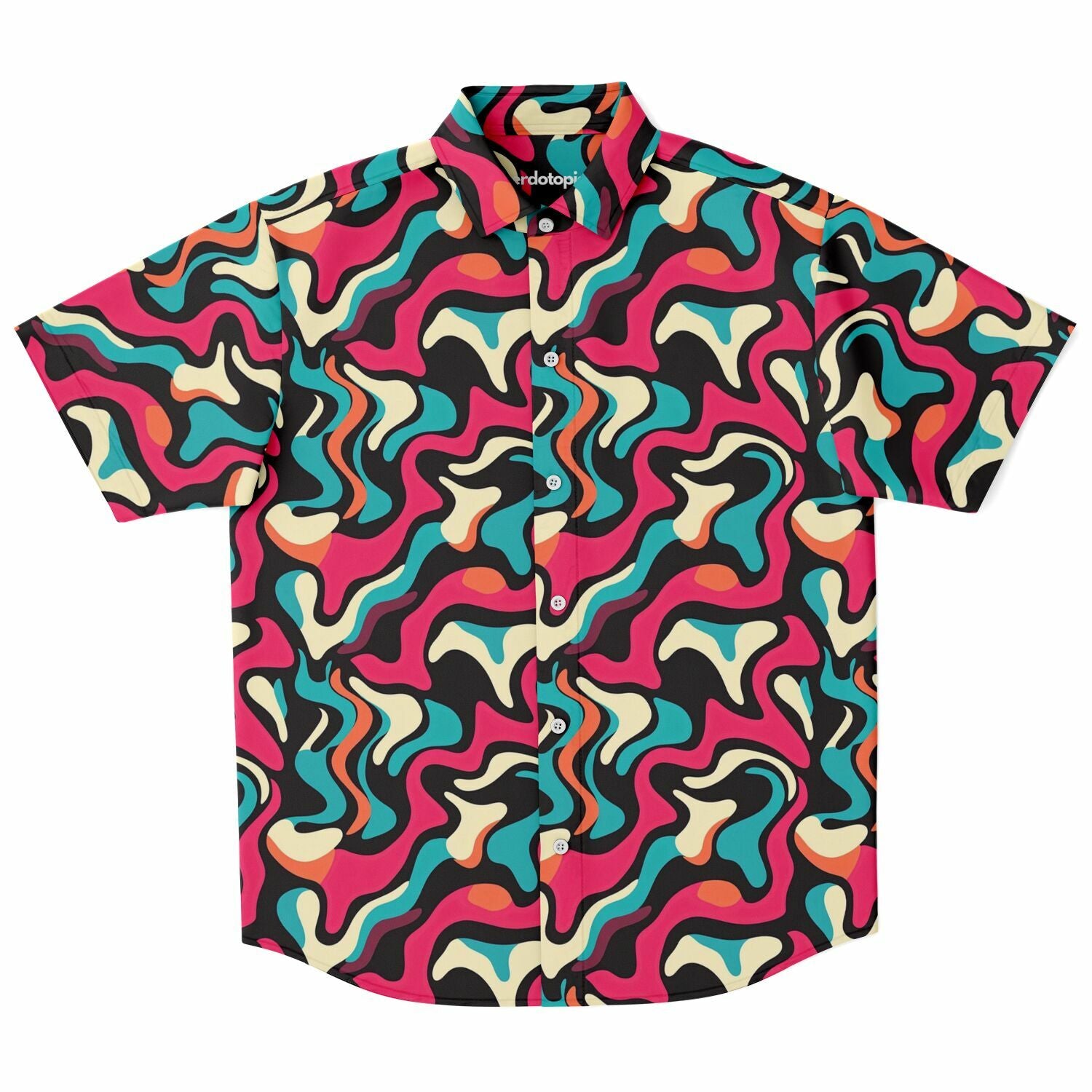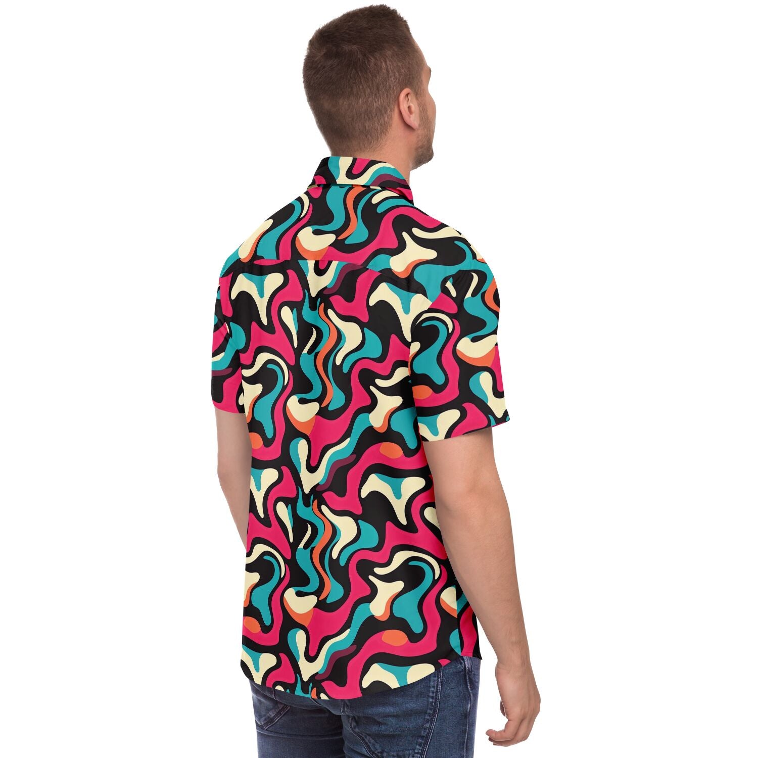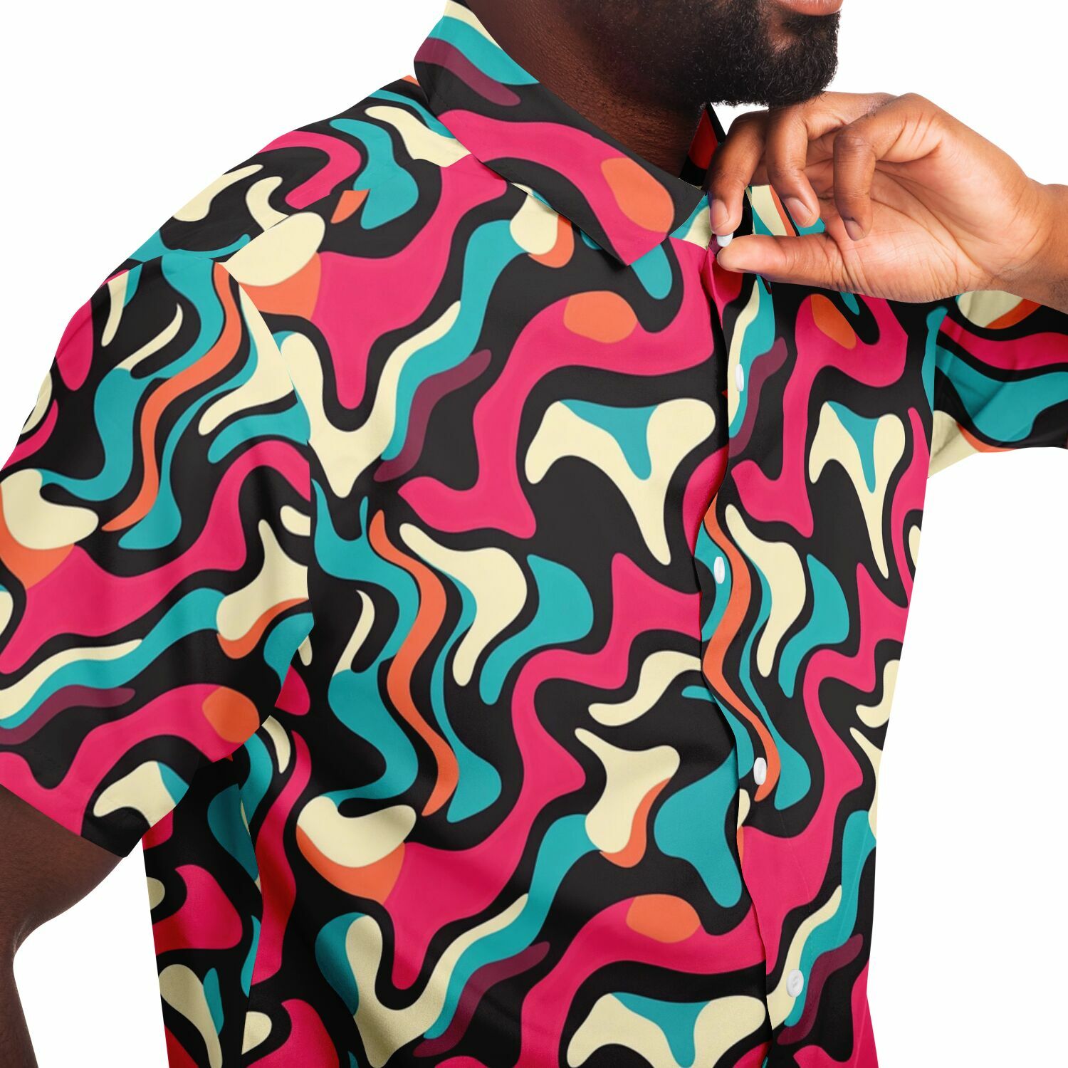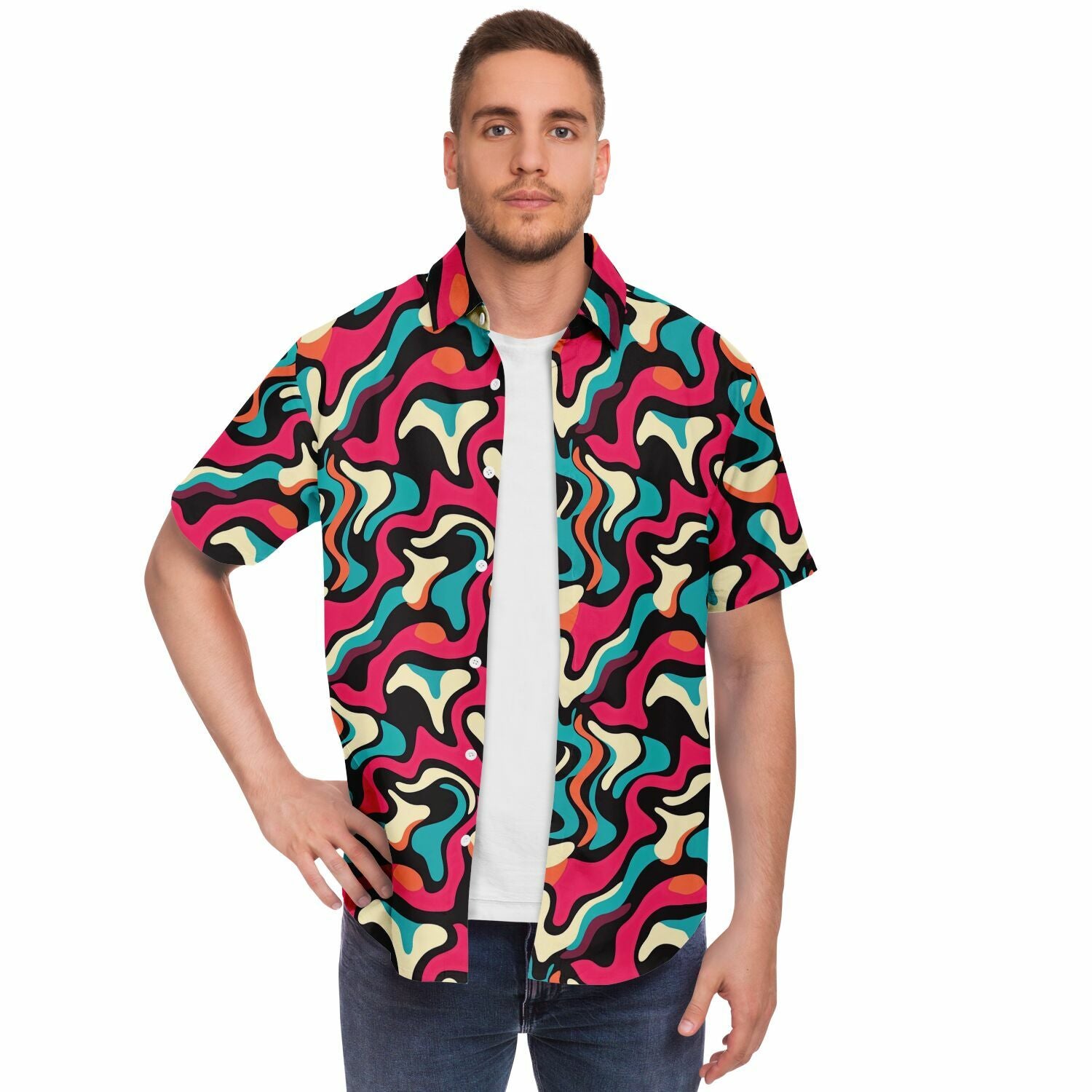 Red Blue Pattern Short Sleeve Button Down Shirt - AOP