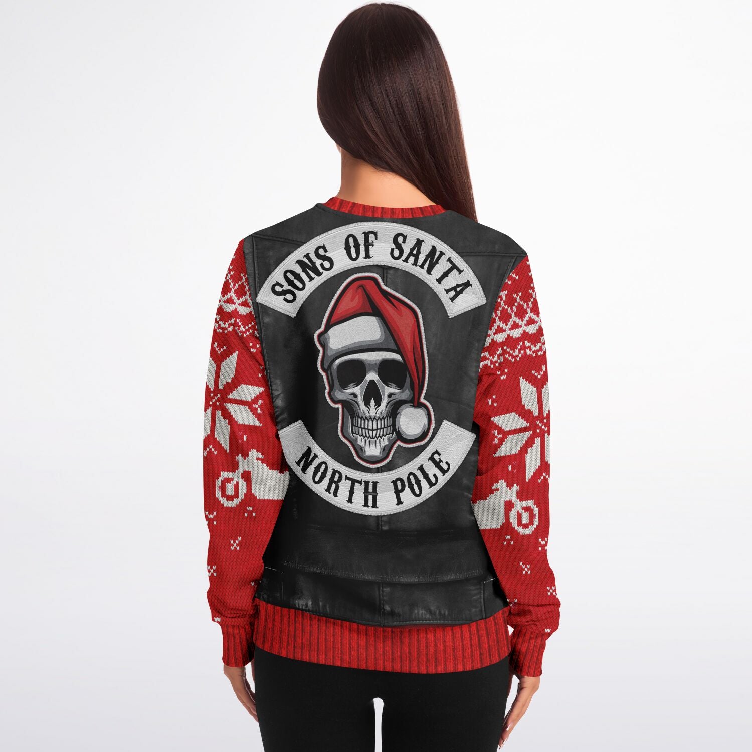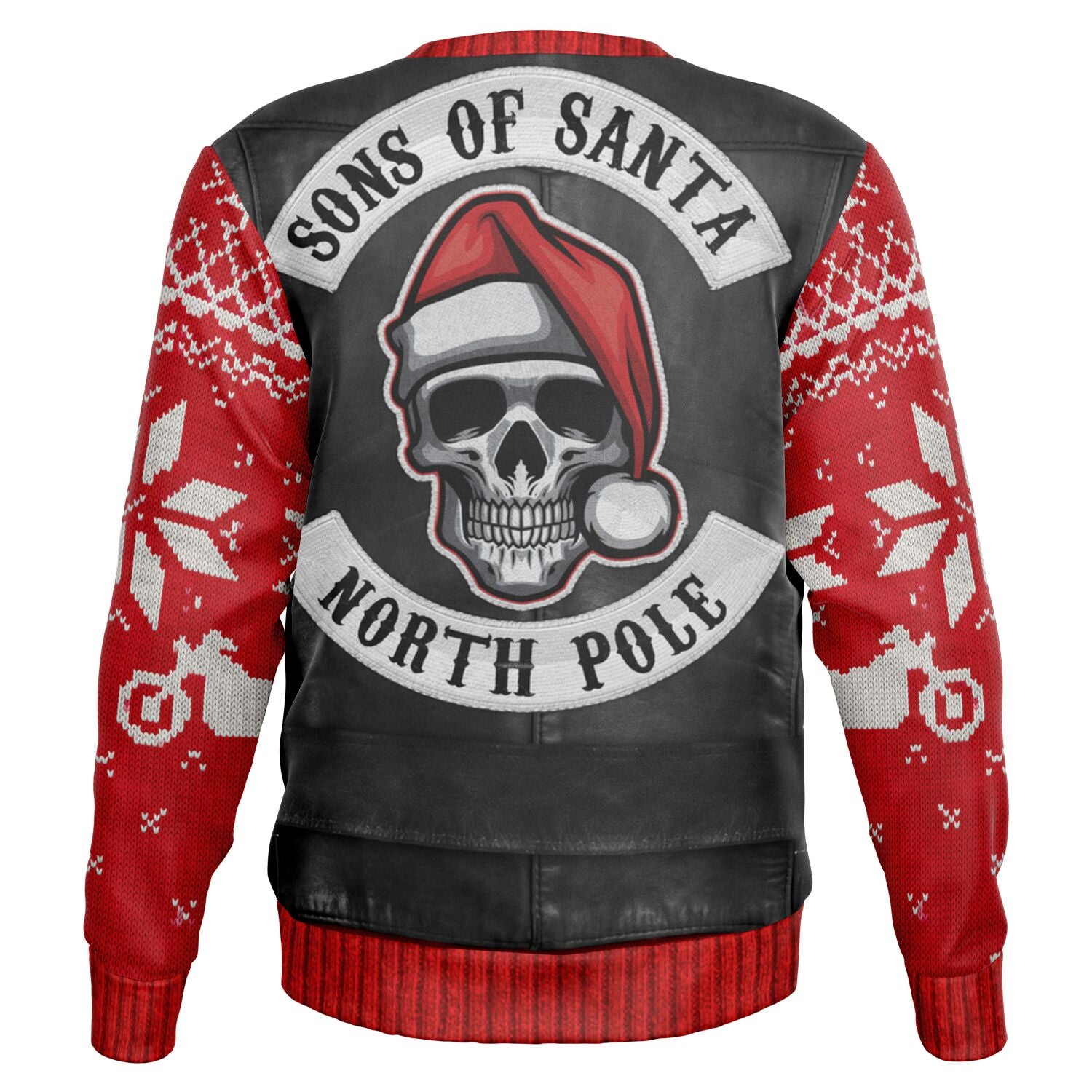 Bring a rebellious holiday vibe to your wardrobe with the Sons of Santa Biker Jacket Print Sweatshirt. Inspired by biker culture with a festive twist, this all-over print design makes Santa the ultimate outlaw of Christmas. Perfect for holiday parties, casual hangouts, or anyone who wants to add a tough edge to their Christmas spirit, this sweatshirt is as bold as it is comfortable.