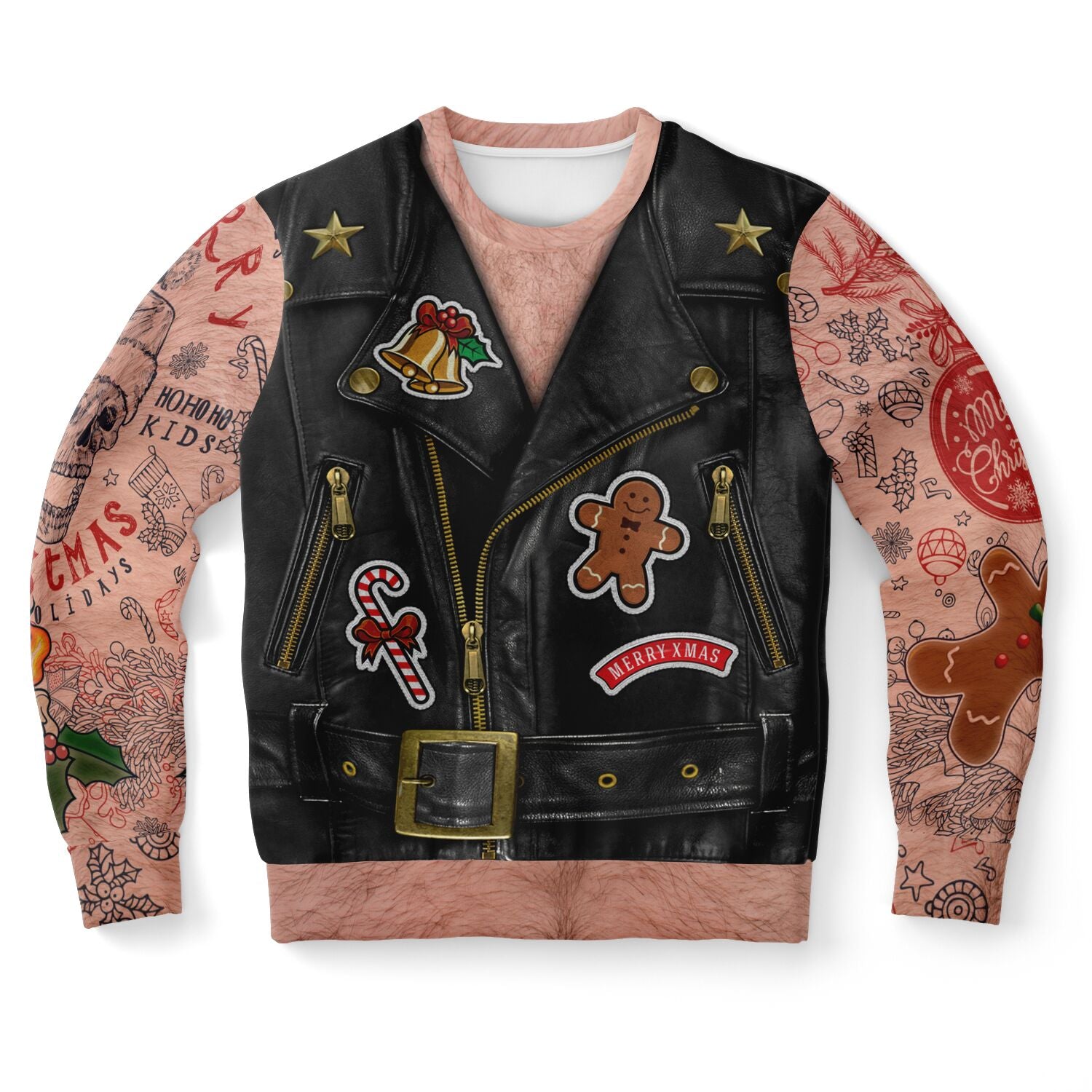 Ride into the holidays in style with the Sons of Santa Biker Leather Jacket Printed Sweatshirt. Inspired by the rebellious biker aesthetic with a festive twist, this sweatshirt brings together Christmas cheer and a bold, rugged look. Perfect for holiday parties, casual wear, or anyone who loves a mix of edge and festive fun.