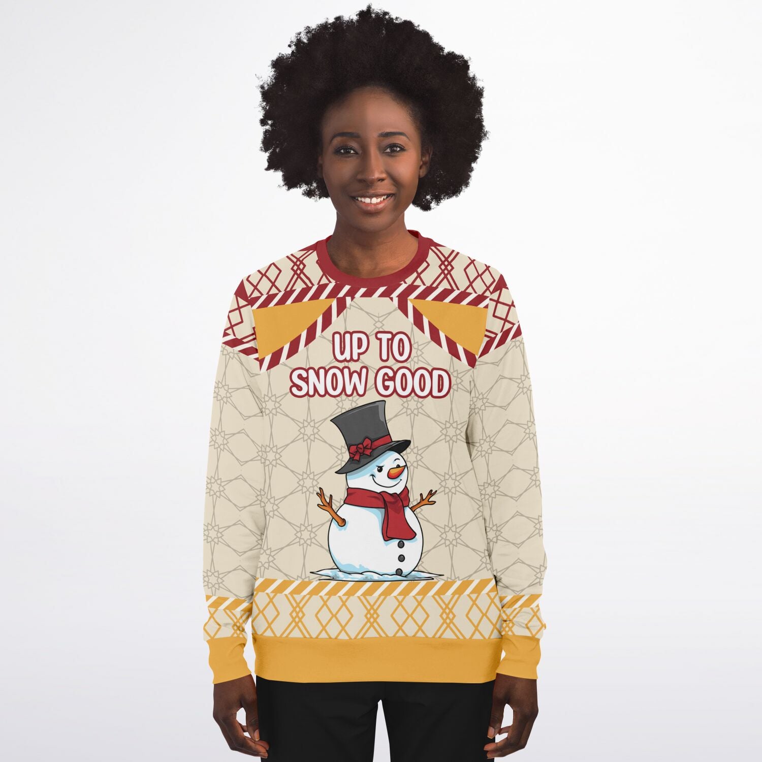 Stay cozy while showing off your playful side with the Up to Snow Good Holiday Sweatshirt. With its cheeky seasonal pun, this sweatshirt is perfect for holiday parties, casual outings, or just lounging at home in festive style. A fun and lighthearted choice for anyone who loves humor and holiday cheer.